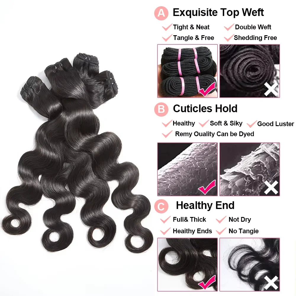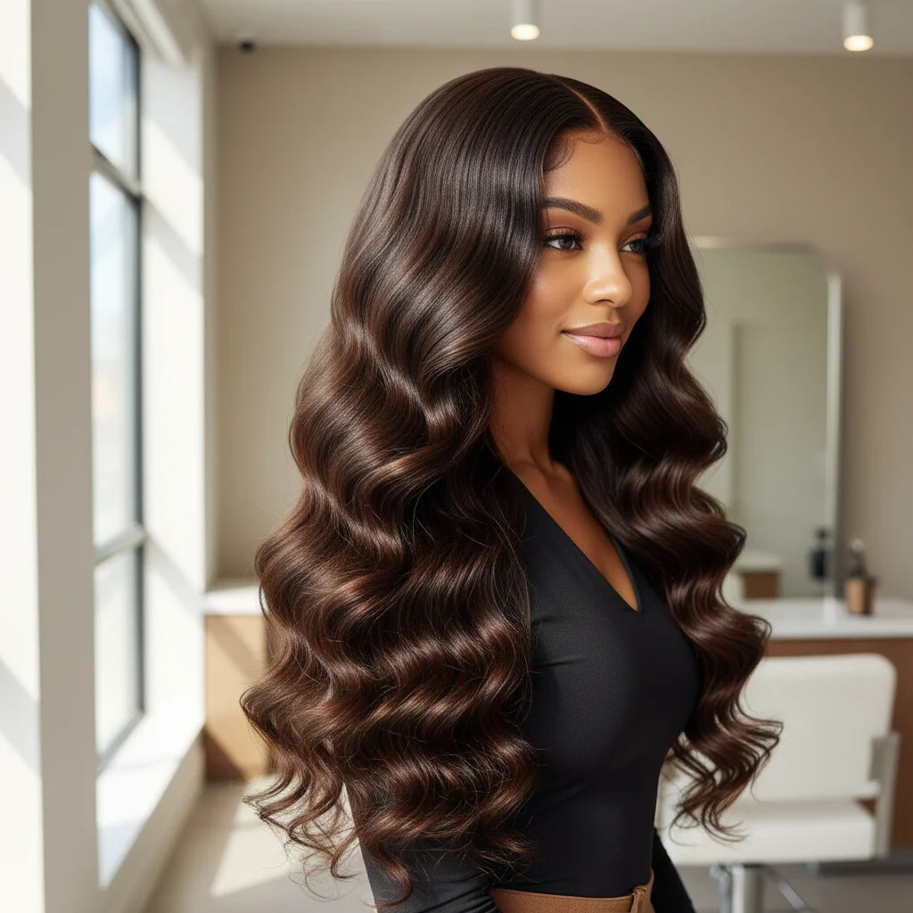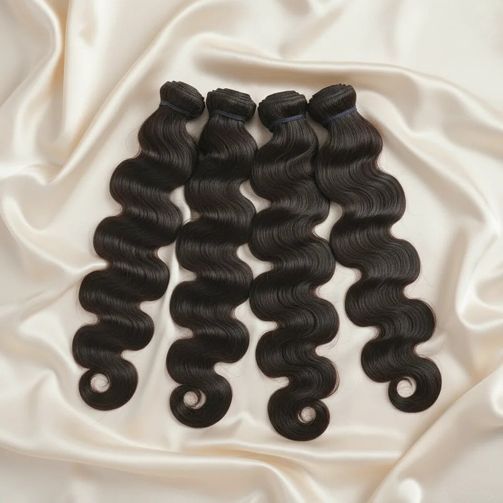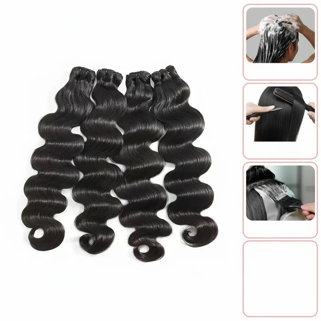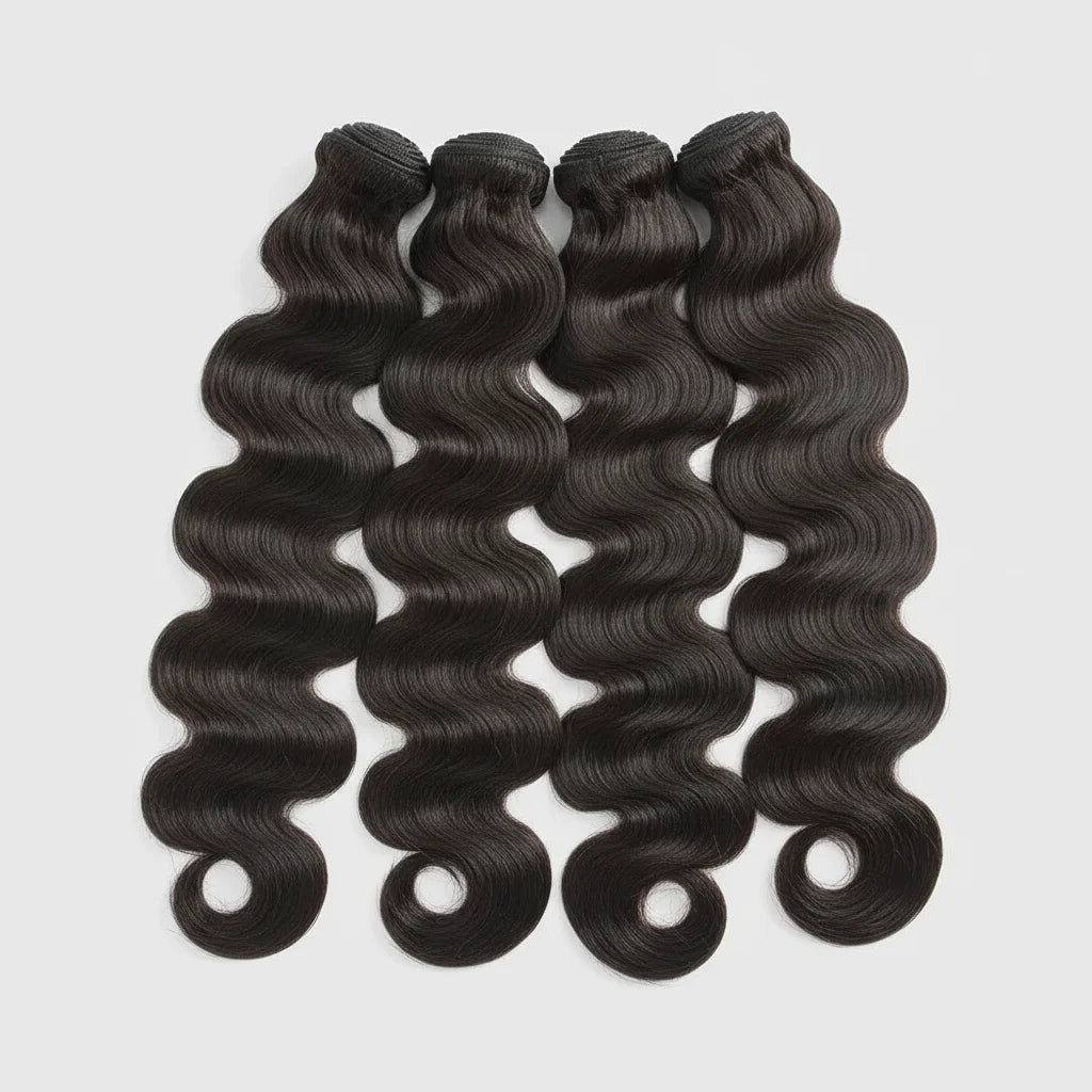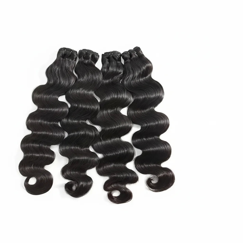 Raw Indian Remy hair bundles with silky body wave texture and reinforced machine double weft for secure installation. Completely untreated and chemical-free, these extensions readily accept all dye shades and support perming for personalized styling. Engineered for professional weaving work.