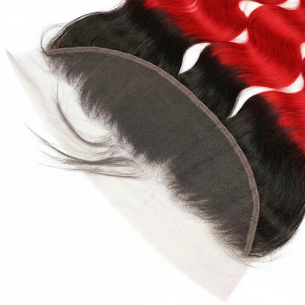 Flaming Red Peruvian Human Hair Body Wave Lace Frontal With Bundles Authentic Peruvian human hair in a stunning 1B red ombre shade. This body wave lace frontal features a 13x4 Swiss lace base with double machine weft construction for durability. Each bundle weighs 100g and the frontal weighs 30-60g. Available in lengths from 10-26 inches. For a complete look, pair with 3 bundles (under 18") or 4-5 bundles (18" and up). Darker colors require bleaching. Transform your style with premium quality hair that blends seamlessly.