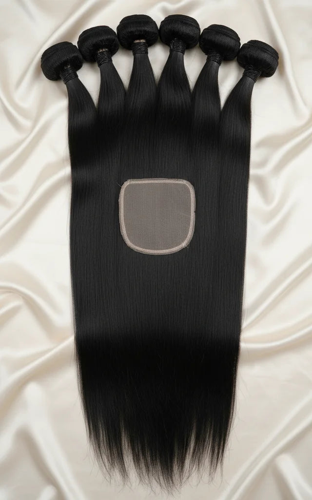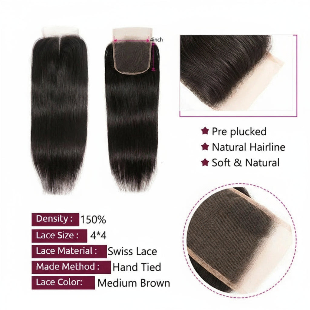 Elevate your hair game with authentic Brazilian straight hair bundles crafted from 100% unprocessed Remy hair. This premium collection includes three weft bundles paired with a 4x4 lace closure for a seamless, natural-looking installation. The straight texture takes chemical processing beautifully—perm it to your desired style with confidence. These bundles are free from harsh chemicals and accept darker dye colors for customization. Whether you're seeking length, volume, or a complete transformation, this versatile set delivers the quality and flexibility you deserve for flawless results.